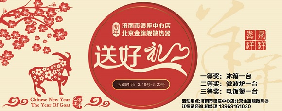 开年北京金旗舰散热器送好礼了,凡进济南市北园银座中心店北京金旗舰散热器店面业主即可赠送精美拉车一辆。凡签单购买客户满三组以上送一组,更有大奖等你拿。保证折上折,一年仅此一次,不容错过。