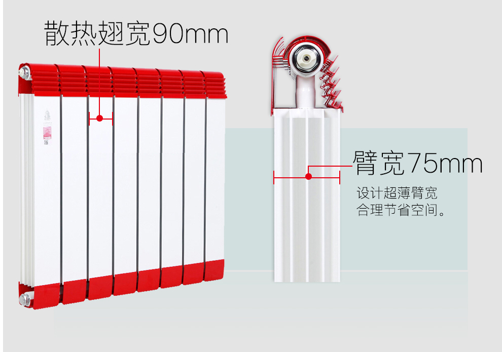 金旗舰成功自主研制出国内第一款集“环保、安全、防熏墙”三重功效于一体的产品——“防熏墙”系列铜铝复合散热器,该散热器增加防熏墙扣帽设计,独特的防熏墙原理设计,大大有效的杜绝墙面的熏黄与熏黑,对墙面的保护近乎完美,是品味一族的不二之选。同时它拥有大水道,大翅片,大散热量,稳重典雅的设计,通过千万道工序的审核。